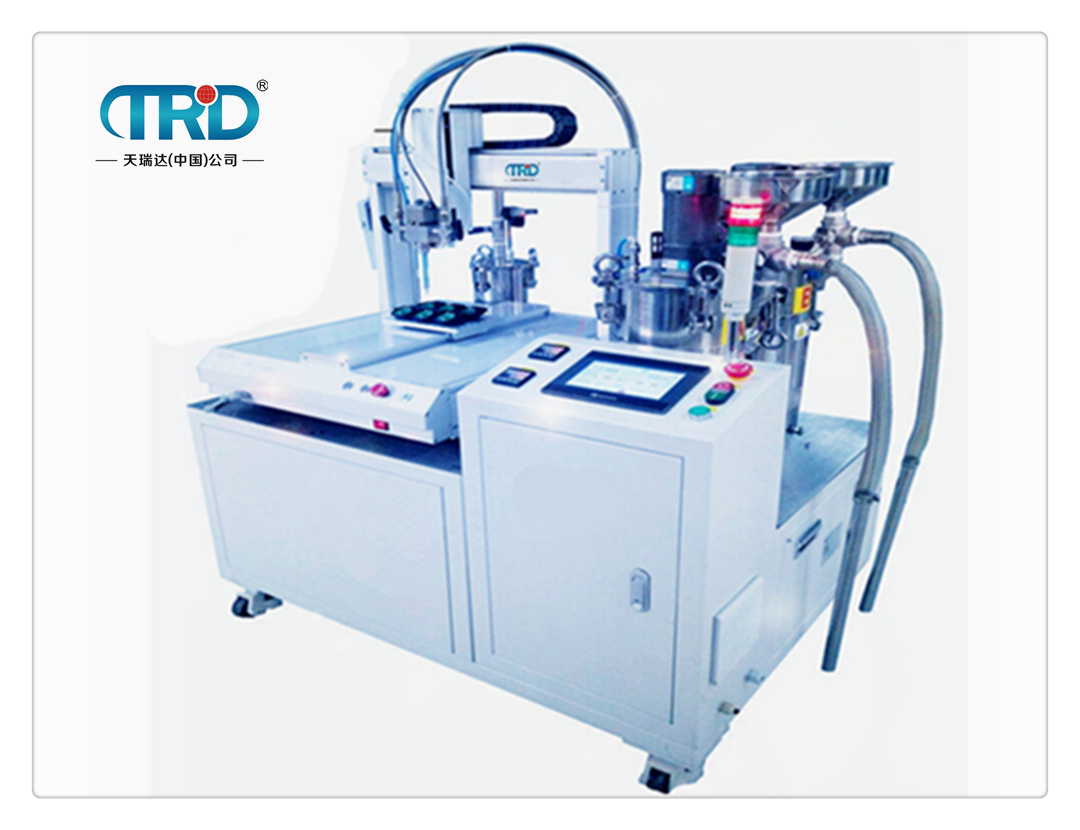 产品介绍TG-VR5510F大胶量自动灌胶机可对各种工件进行灌注工艺等。具有点、线、面、弧、圆及三轴联动等功能,能适应任何不规则物件灌胶。并可以提升效率,节省人工,一台设备可达传统5-6个人的产量,独有的控制系统,不受气压因素影响,避免出胶不均、拉丝、气泡等现象。 产品用途 本机能适应任何不规则物件灌胶,适用于不同种类的灌注工艺。常用于LED显示屏灌胶,LED节能灯灌胶,LED电源灌胶,LED灯条,电脑电源灌胶,继电器模块灌胶,传感器灌胶,PCB板灌胶,太阳能电池板灌胶,线圈灌胶等 产品特点 ◆ 本机可由20L原料桶直接供料。也可作原料输送用。 ◆ 采用容积计量式往复泵,可进行连续吐出。 ◆ 由气动马达驱动,通过转速调整吐出速度。 ◆ 中——高粘度时,需安装加强吸盘式样 ◆ 采用液晶屏中文操作界面,易学易懂,可储存100组灌胶参数; ◆ 灌胶速度、灌胶时间、停胶时间皆可参数设定、出胶量稳定,不漏滴胶; ◆ 具有点、线、面、弧、圆及三轴联动等功能,能适应任何不规则物件灌胶; ◆ 节省人工,一台设备可达传统5-6个人的产量;按需配比,实现边混合边灌胶,最大限度节约胶水; ◆ 双料桶设计,A胶和B胶分开储料,保证胶水长时间放置不发生固化; ◆ 独有的控制系统,不受气压因素影响,避免出胶不均、拉丝、气泡等现象; ◆ 储料桶配有液位感应开关,缺料自动报警; ◆ 可选配胶水搅拌、加热并抽真空脱泡功能,适用于不同种类的灌注工艺。